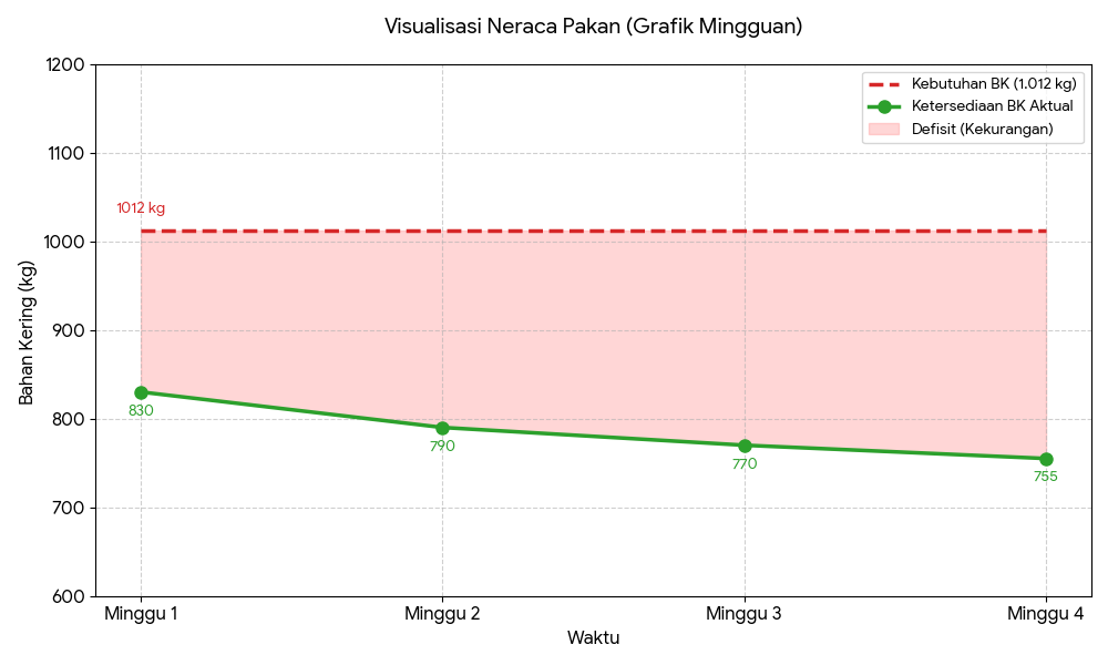 Jika dibandingkan dengan ketersediaan BK, terlihat bahwa peternakan mengalami defisit sejak minggu pertama.
